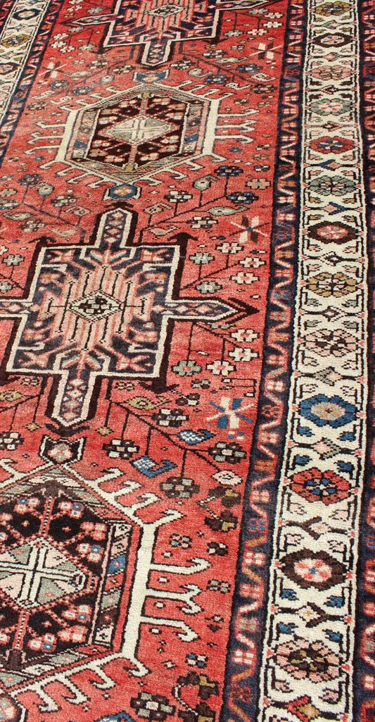 Karadjeh Runner Persian vintage geometric design with red background, rug h-503-04, country of origin / type: Iran / Karadjeh, circa 1950. This mid-20th century, handwoven vintage Persian Karadjeh runner features a red-colored field imbued with ...