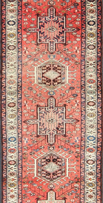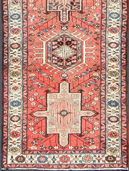 Karadjeh Runner Persian vintage geometric design with red background, rug h-503-04, country of origin / type: Iran / Karadjeh, circa 1950.