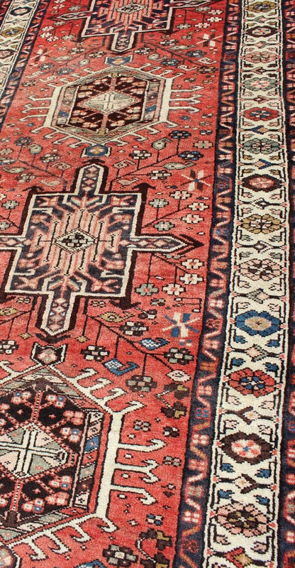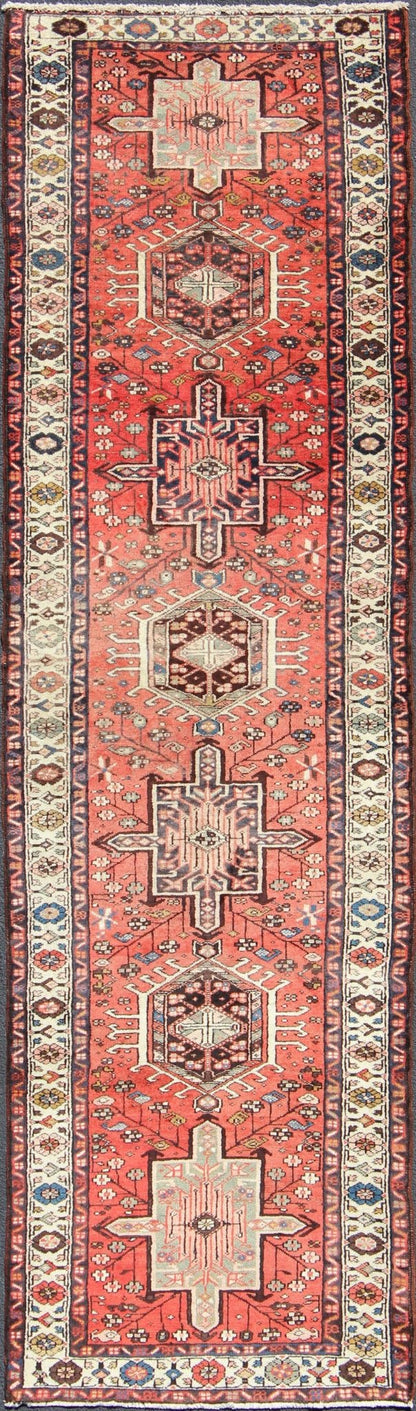 This mid-20th century, handwoven vintage Persian Karadjeh runner features a red-colored field imbued with a vertical line of seven ornate medallions. A beautifully drawn multi-tiered border surrounds the entirety of the piece. The articulation of the motifs is excellent and this rug features beautiful color quality, including red, brown, cream and hints of green and yellow.