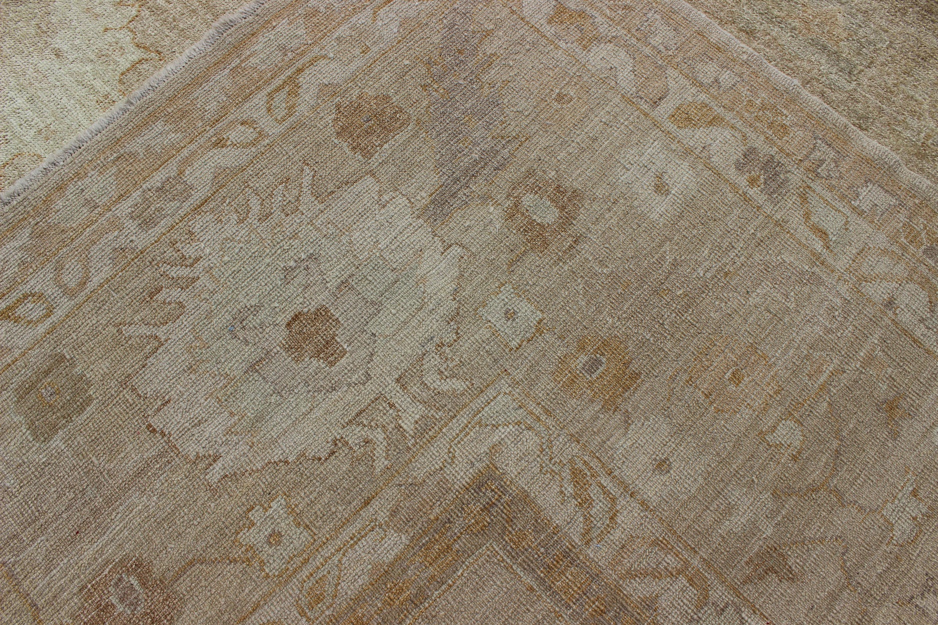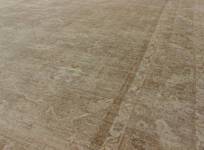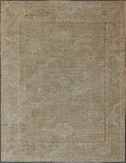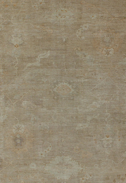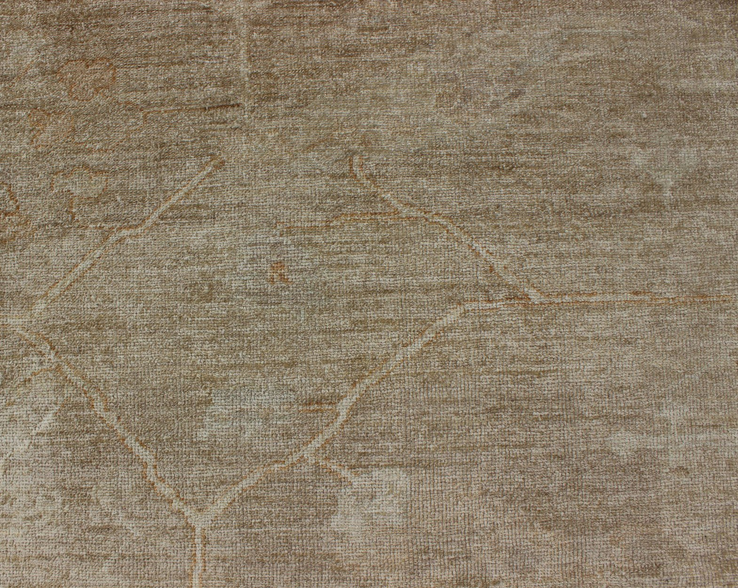 A stunning muted and neutral Turkish angora Oushak carpet with an all over sub-geometric design. This special rug incorporates vintage wool along with angora wool to create the look and feel of its antique counterparts.