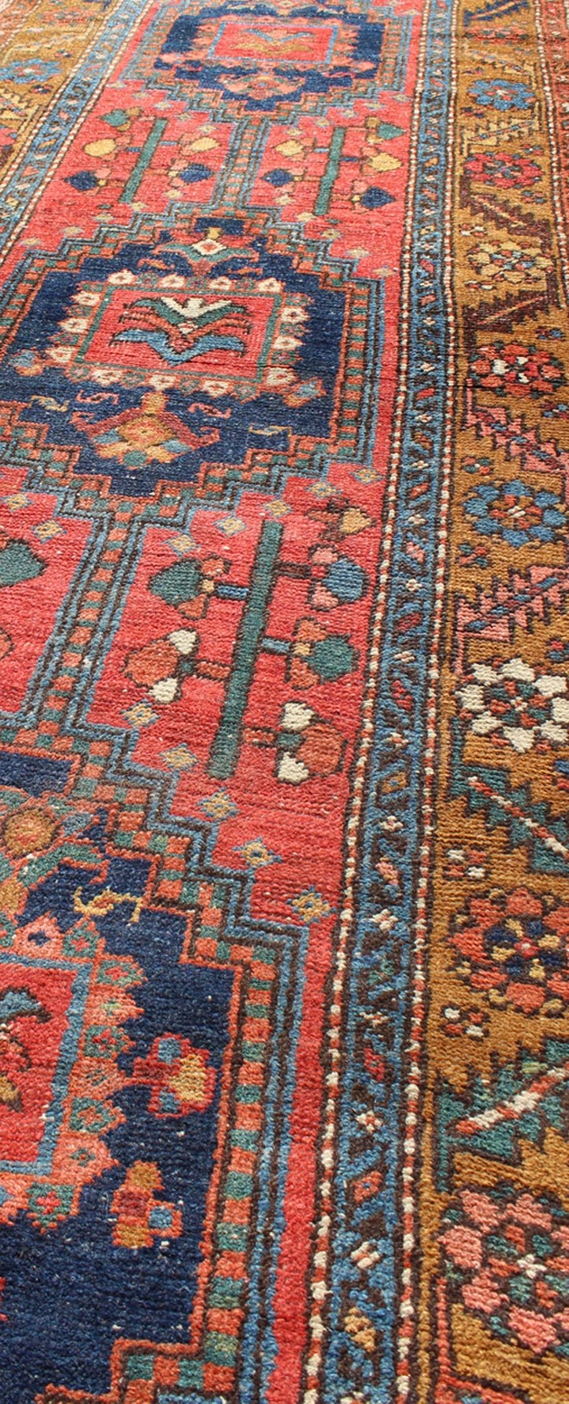 This magnificent Heriz Serapi runner from Iran, circa 1900, bears an exquisite design rendered in gorgeous hues of burnt orange, acid yellow, navy blue, light blue, ivory, green, and salmon pink. Highly stylized sub-geometric medallions anchor the rug and are surrounded by numerous geometric patterns. A complementary border of complex entwined patterns frames the entire piece.