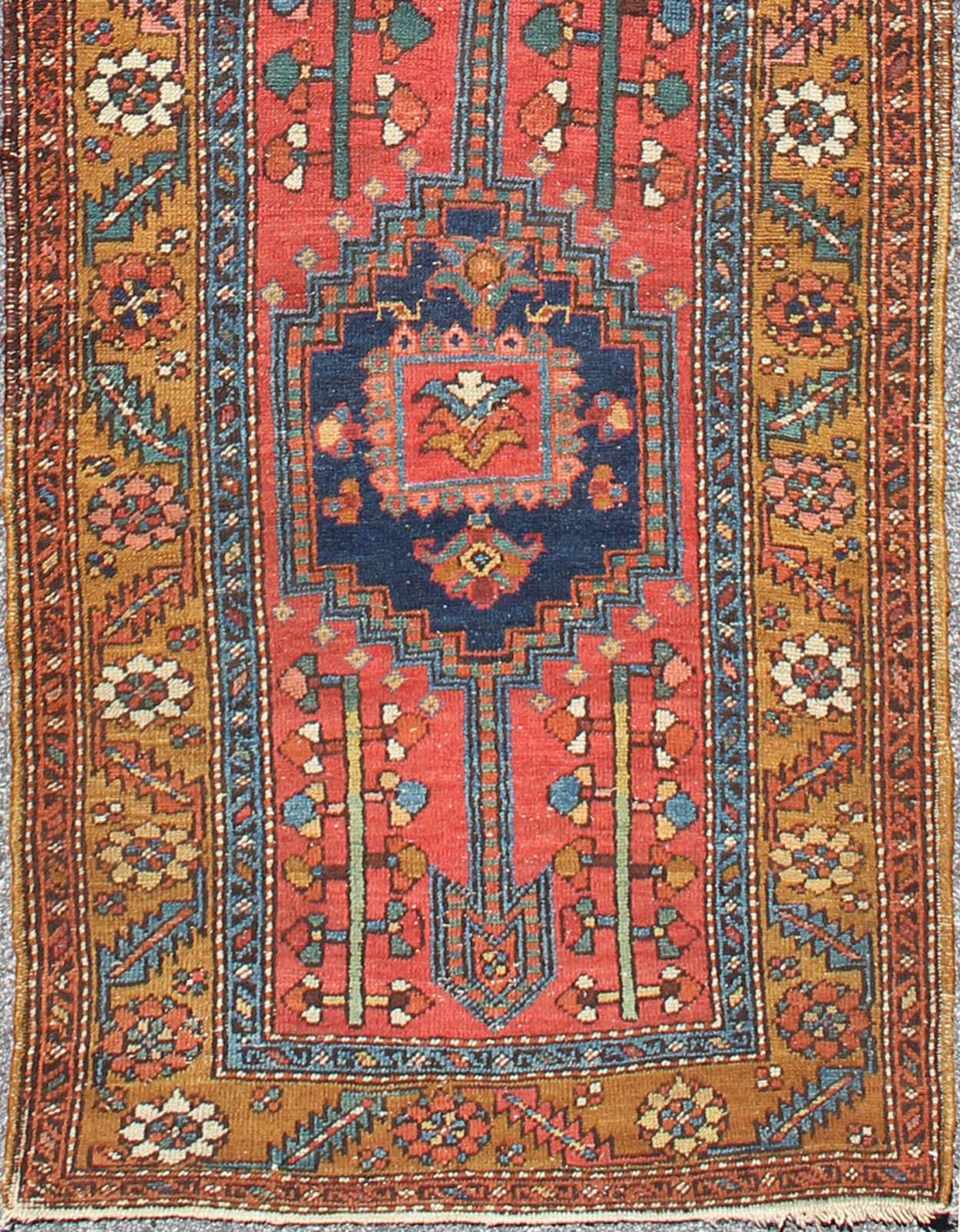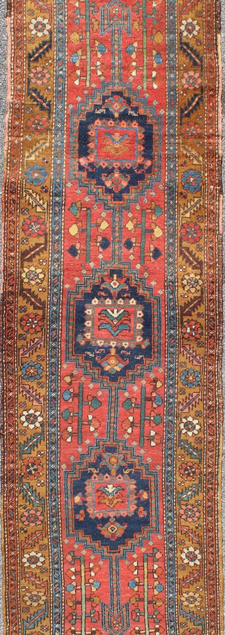 Acid Yellow and Burnt Orange Antique Persian Serapi Runner with Medallions, rug 13-0519, country of origin / type: Iran / Heriz Serapi, circa 1900