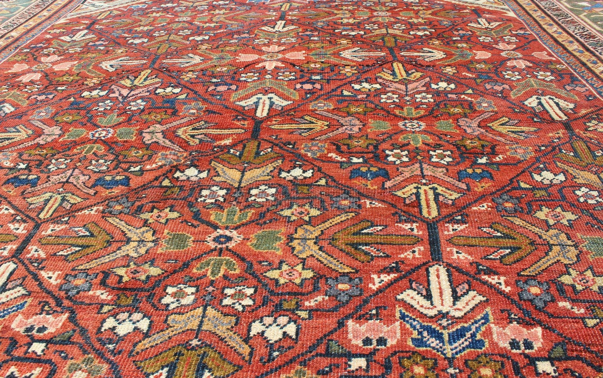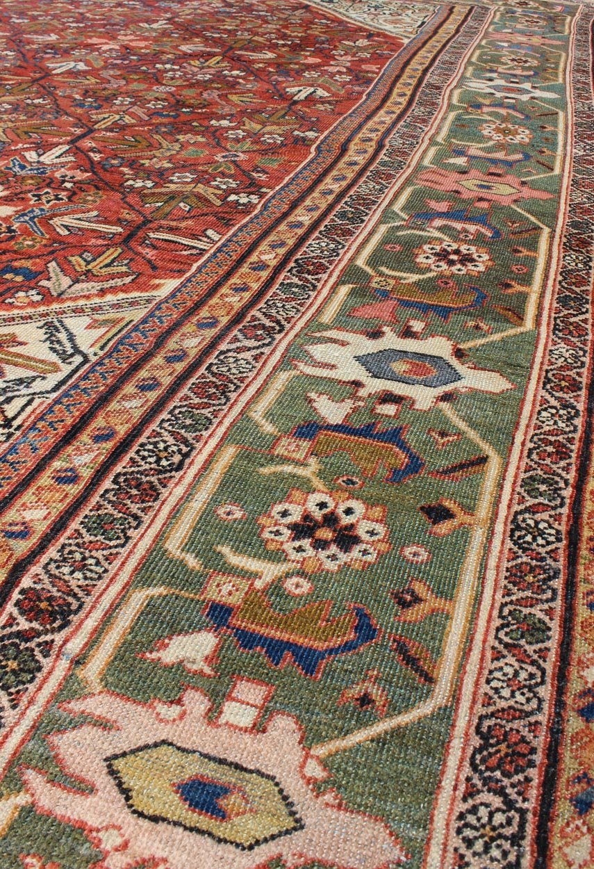 Antique Persian Sultanabad Rug The expansive terra-cotta red background of this piece consists of an intricate all-over design surrounded by a wide green border with ample motifs. Delicate vine-scrolls and sub-geometric elements emphasize the ae...