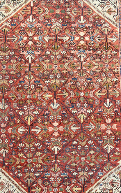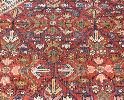 The expansive terra-cotta red background of this piece consists of an intricate all-over design surrounded by a wide green border with ample motifs. Delicate vine-scrolls and sub-geometric elements emphasize the aesthetic of Persian weaving along with European influence.