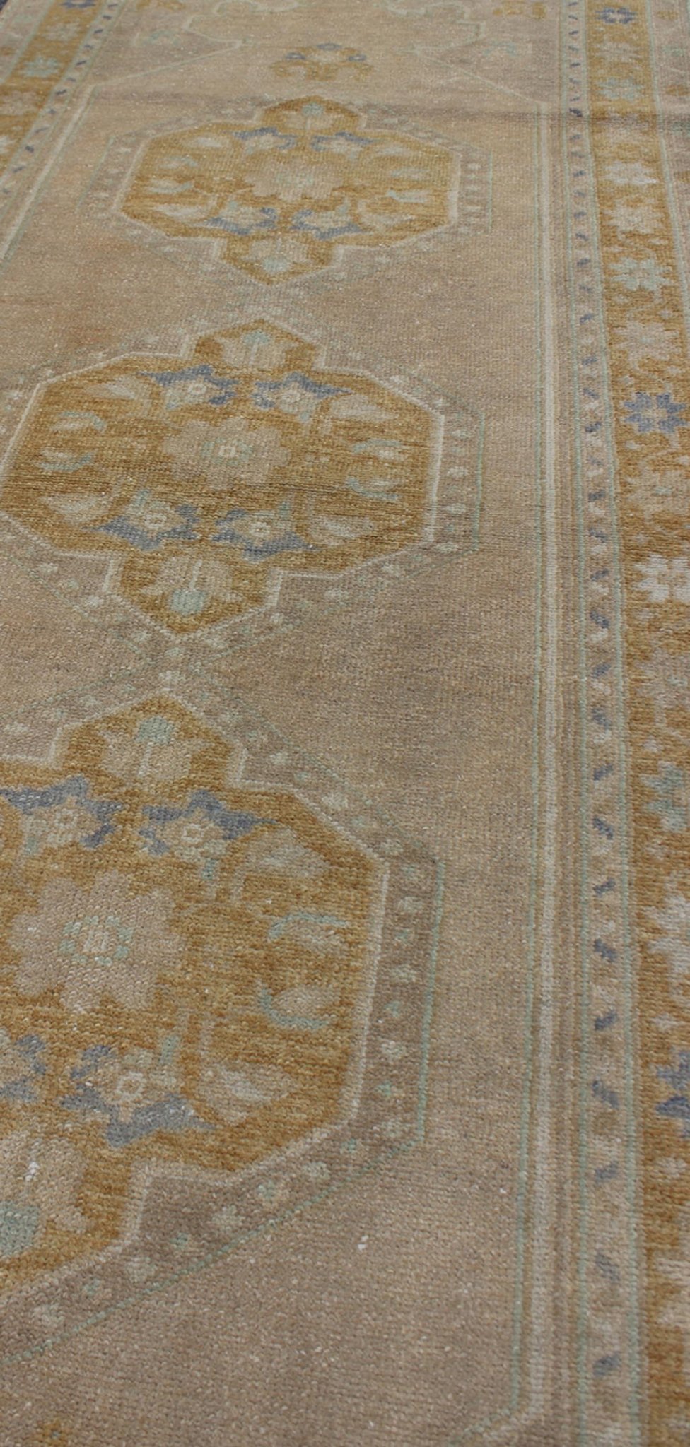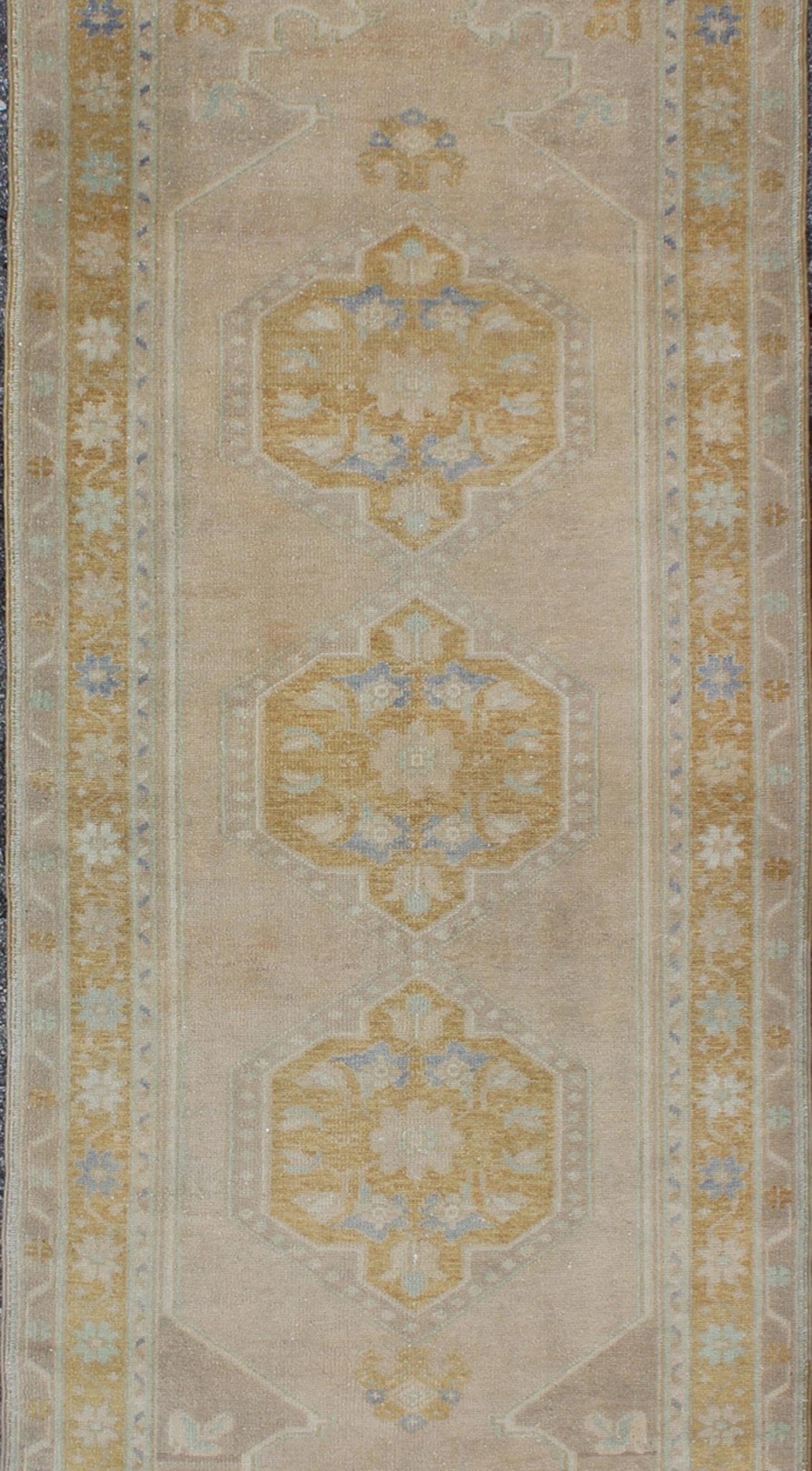 This vintage Oushak runner features a unique blend of cheerful colors and an intricately beautiful design. The floral medallions are complemented by other similar designs in the surrounding borders. The various shades of acid green, gray, and cream blend beautifully with the cool taupe background.