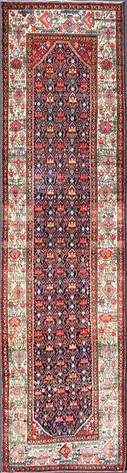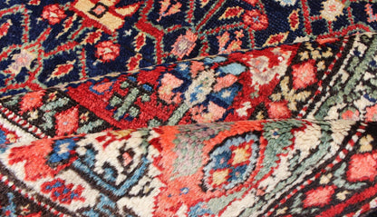 Red, Blue, Ivory, Peach, and Mint Persian Antique Malayer Runner with Geometric Floral Design, rug ema-7521, country of origin / type: Iran / Malayer, circa 1920