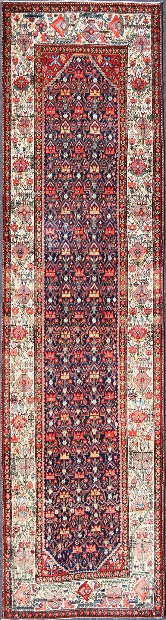 Jewel-Toned Antique Persian Malayer Runner with All-Over Geometric Design Red, Blue, Ivory, Peach, and Mint Persian Antique Malayer Runner with Geometric Floral Design, rug ema-7521, country of origin / type: Iran / Malayer, circa 1920 Th...