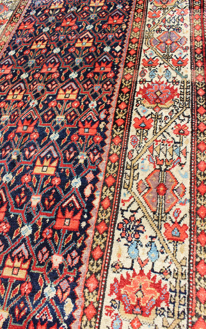 This antique Persian Malayer runner, circa early 20th century, relies heavily on exquisite details as well as all-over geometric designs. A fine trellis of beautifully colored motifs sprawls across the midnight blue field, pulsating with alternating rhythms. The intricate design imbues the rug with a beautiful articulation of pattern. Colors include midnight blue, rich red, peach, mint, light blue, and ivory.