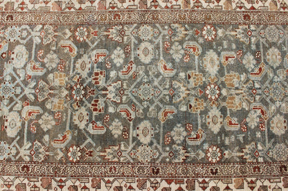 This long antique Persian Malayer runner, circa 1900s, is an intricate and unique piece. The gray blue central field plays host to an all-over design of various geometric motifs rendered in shades of gray, blue, burnt orange, brown, and cream. The multi-tiered border is an extension of the geometric designs and features a color palette complementary to that of the rug's center. At approximately 15.5 feet in length, this runner is perfect for hallways.