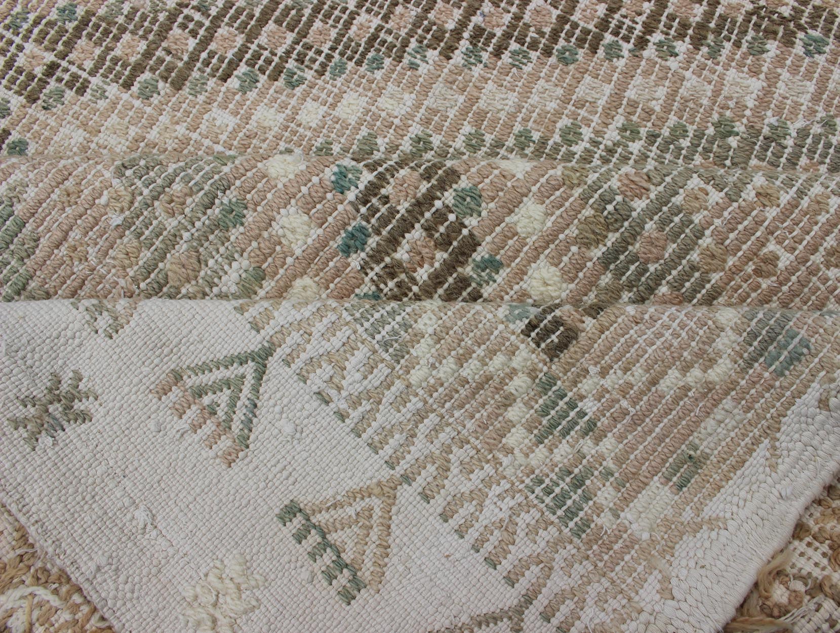 Embroidered vintage Kilim rug from Turkey in shades of tan, Taupe, light Brown, green and light yellow green with geometric pattern, rug EN-179003, country of origin / type: Turkey / Kilim, circa 1950.
