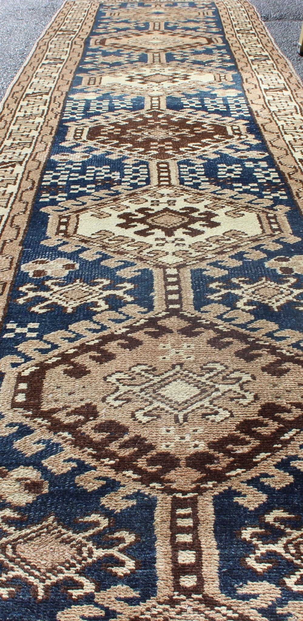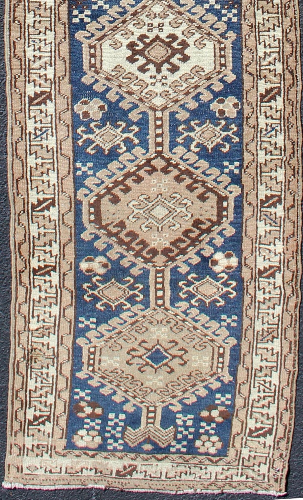 Antique Blue Tribal Karajeh Runner With Navy Blue, Brown and Earth Tones. Antique Persian Karajeh runner with stacked medallion in taupe, cream, blue, rug PRM-M522, country of origin / type: Iran / Karajeh , circa 1920 This antique Persian k...