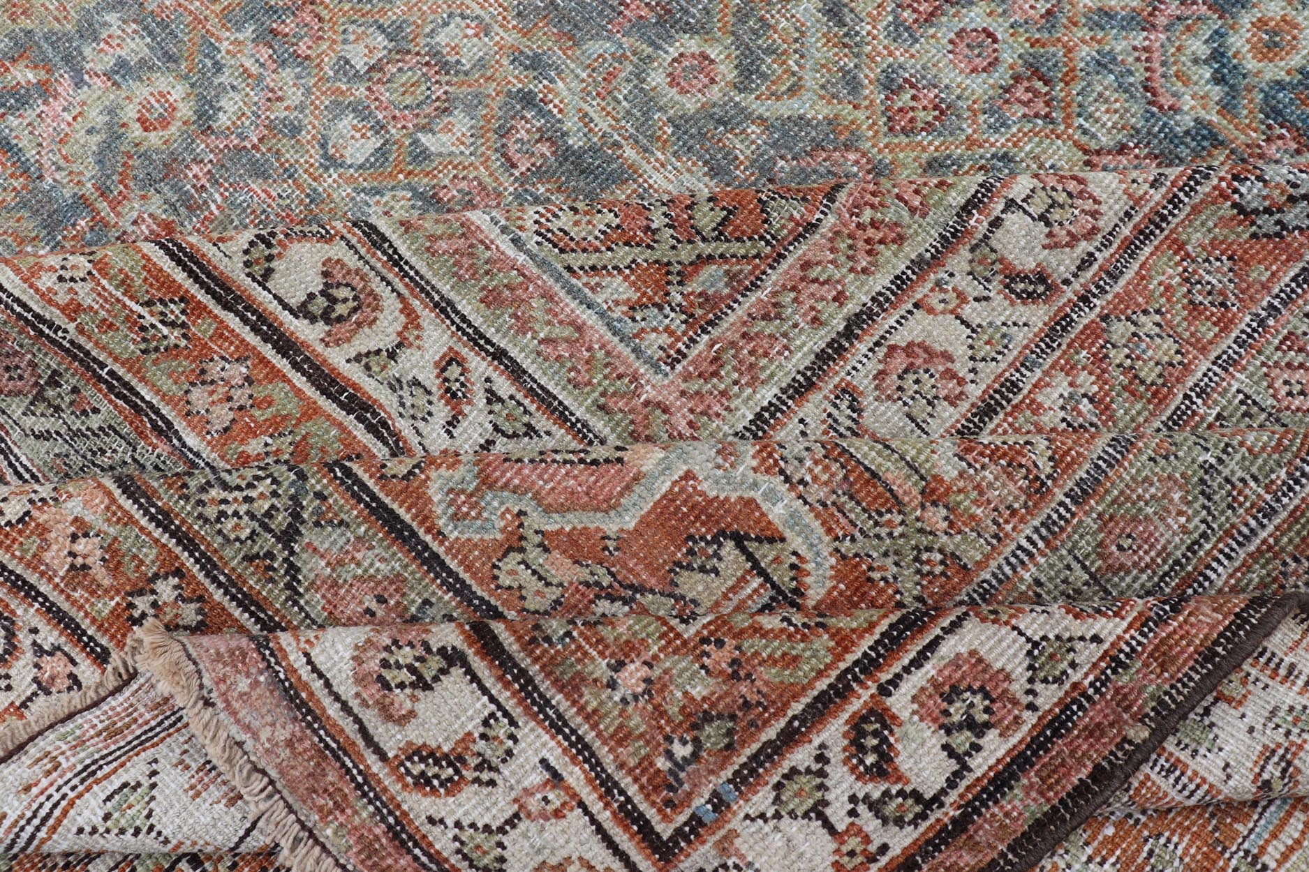 This impressive antique distressed Persian Sultanabad rug features a superb all-over Herati and sub-geometric design throughout the entirety of the piece. The entire body is enclosed by complementary, multi-tiered borders. The rug is rendered in variegated tones of blue, gray, light teal, blue gray, and enclosed by soft red orange border. The accent colors include brown, coral, cream, green and ivory; making this rug a marvelous fit for a variety of classic, traditional and transitional interiors.