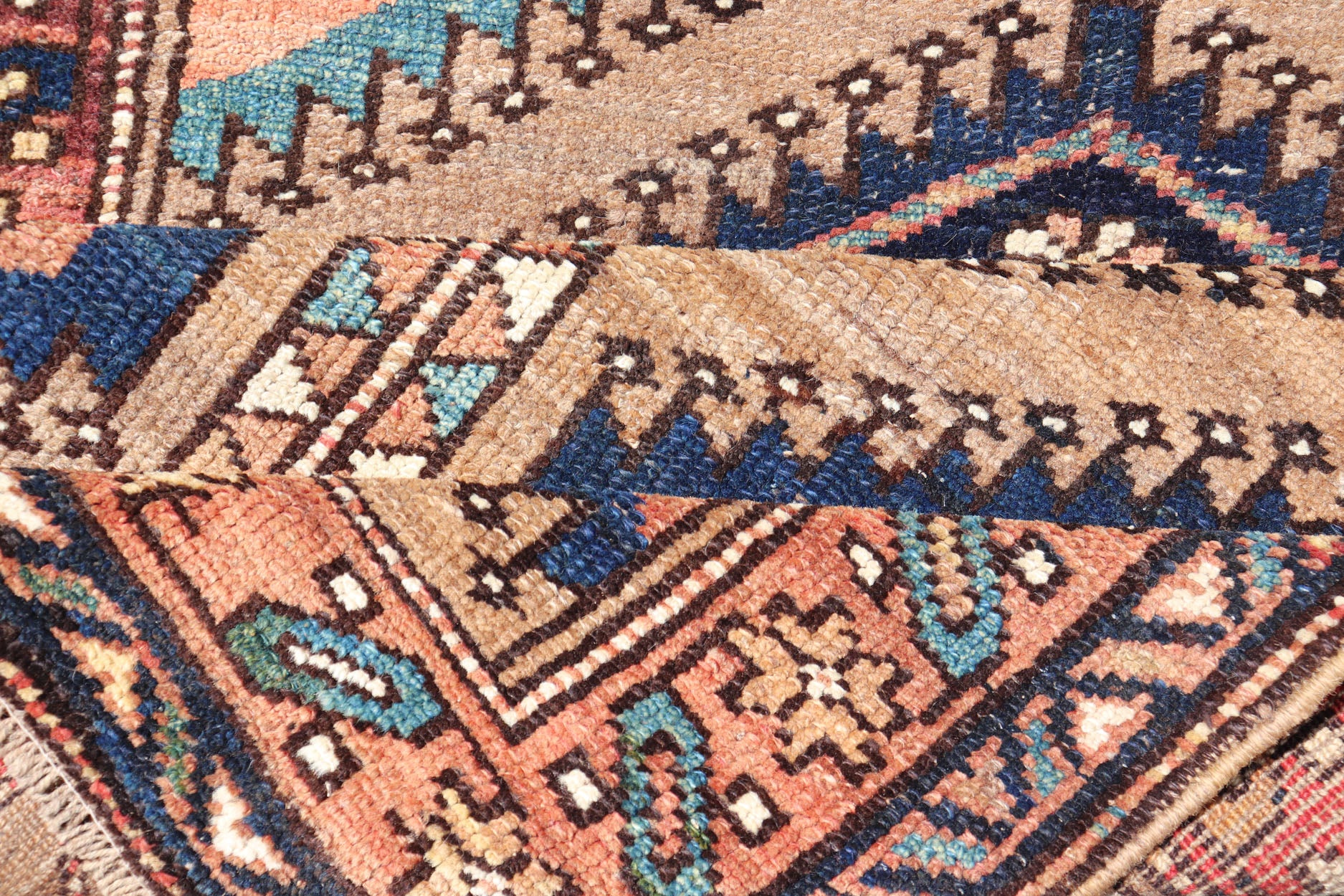 This antique Kurdish (circa early 20th century) short runner features a unique blend of colors and an intricately beautiful bold design. The medallion design consists of various geometric motifs surrounded by complementary figures in the surrounding border. The various shades light camel cover the ground and complemented by beautiful Red, blue, camel, green, coral color, navy, soft yellow and surrounded by repeating geometric border in salmon and coral colors.