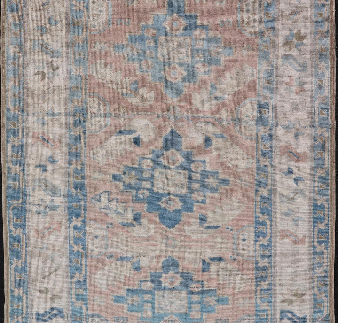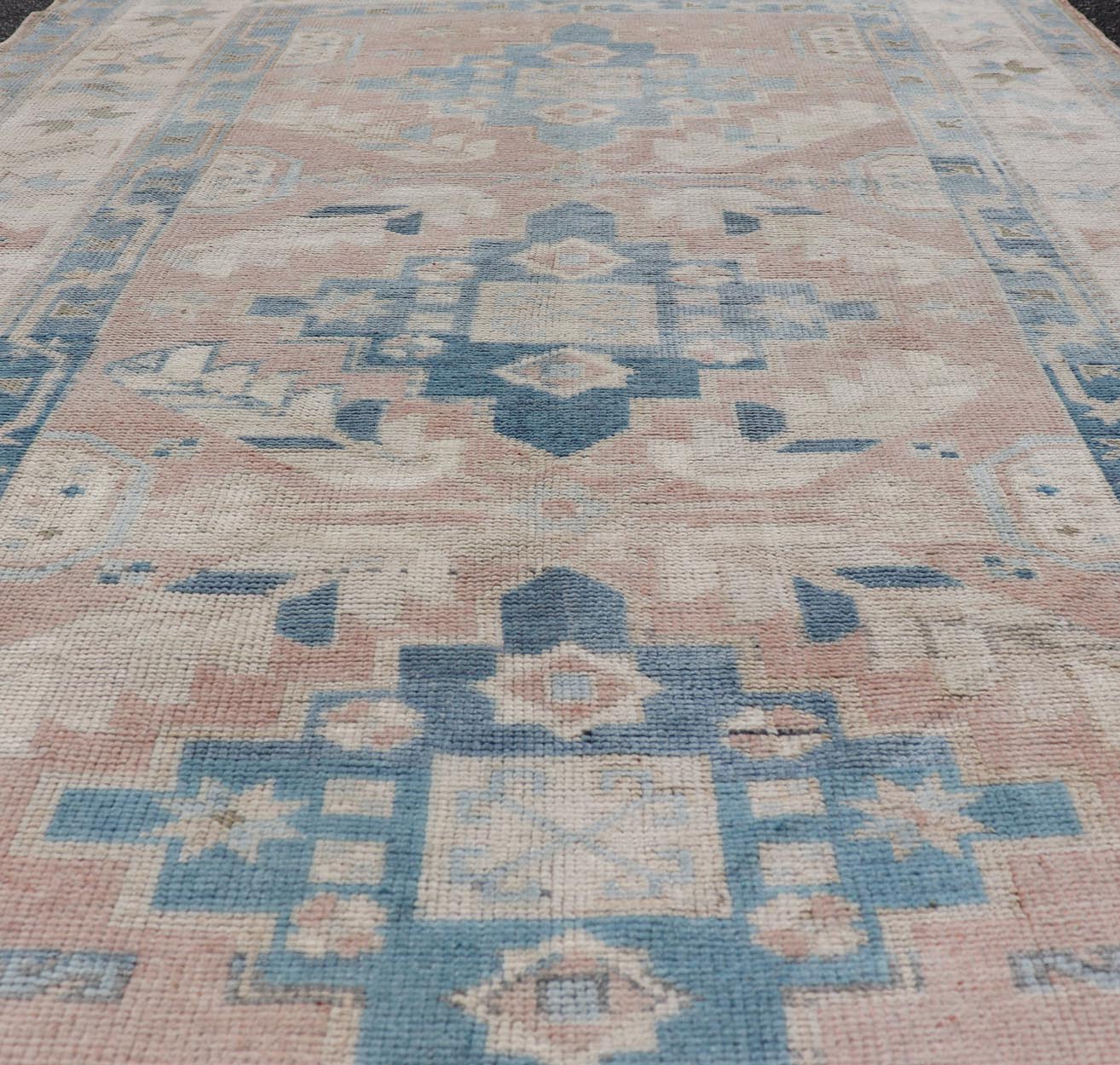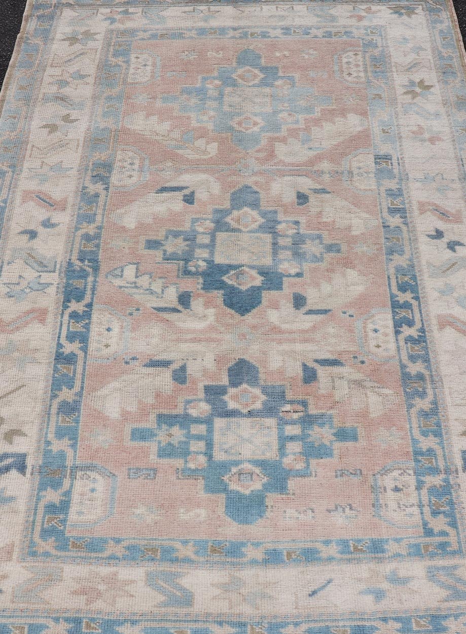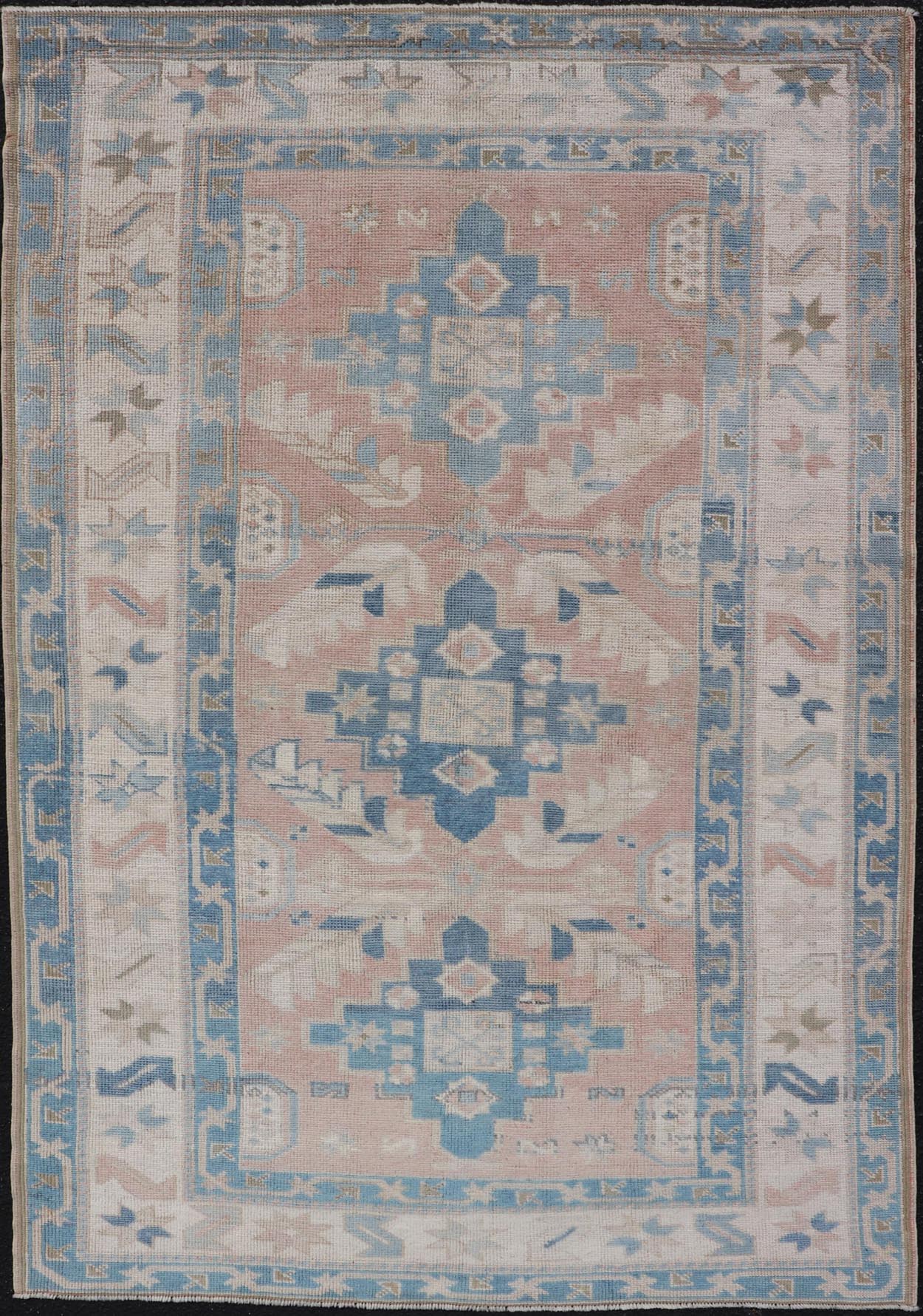 Turkish Oushak Vintage Carpet with Tri Medallion Design. Turkish Oushak Vintage Carpet from Turkey a variety of blue, salmon, beige and natural tones. Keivan Woven Arts / rug EN-178331, country of origin / type: Turkey / Oushak, circa 1940