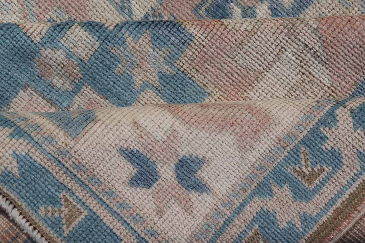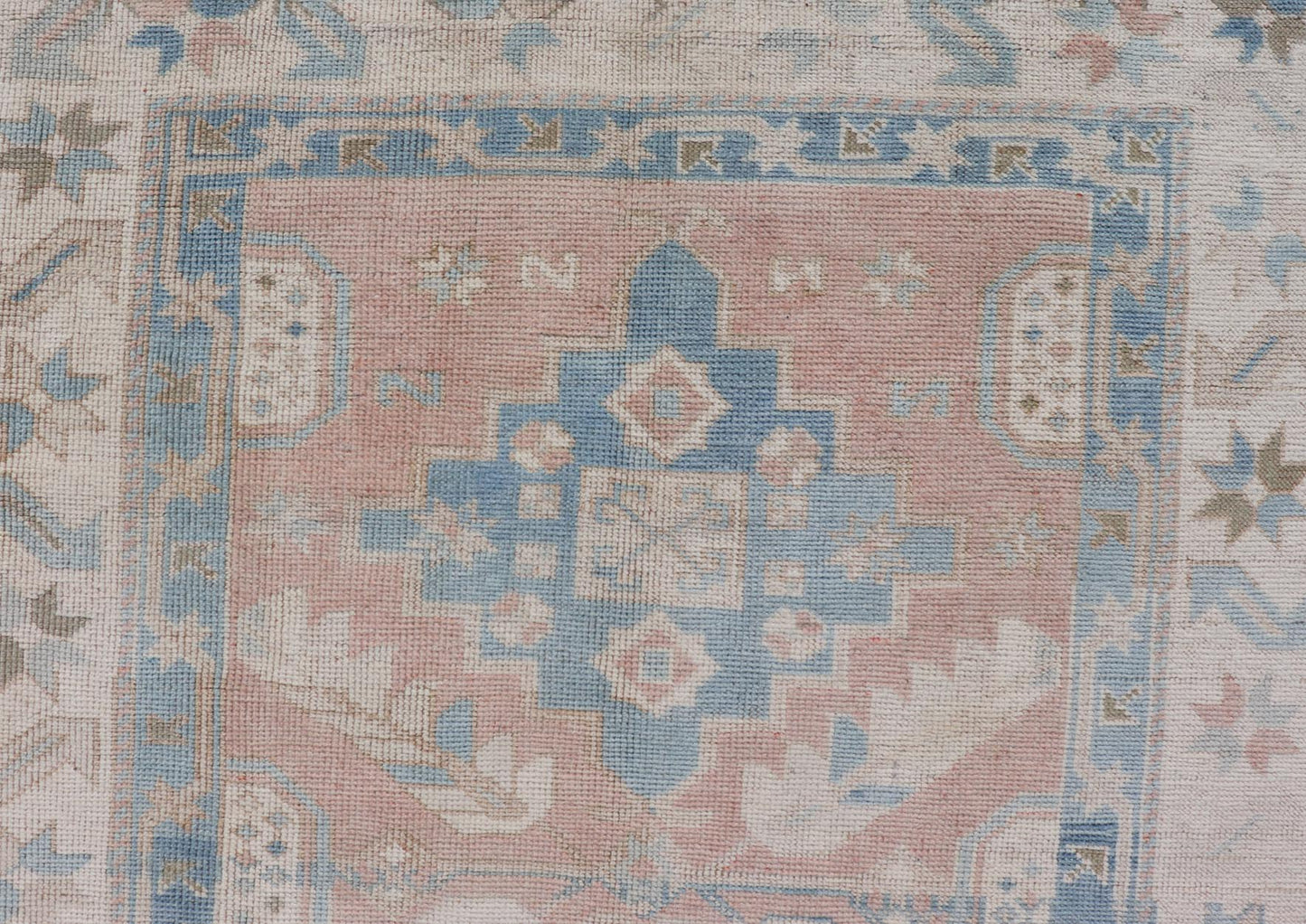This vintage Turkish Oushak rug features an intricately designed medallion's resting in the central field. The design is rendered in a variety of blue, salmon, beige and natural tones which makes this piece very versatile. The subtle border is filled with complementary motifs and imbues the rug with dimension. Turkish Oushak Vintage Carpet, Oushak Vintage Carpet, Turkish Oushak Carpet, Turkish Oushak Vintage Carpet. Blur Oushak, Vintage blue Oushak ,This vintage Oushak is in overall very good to near excellent condition for its age, with even pile throughout.