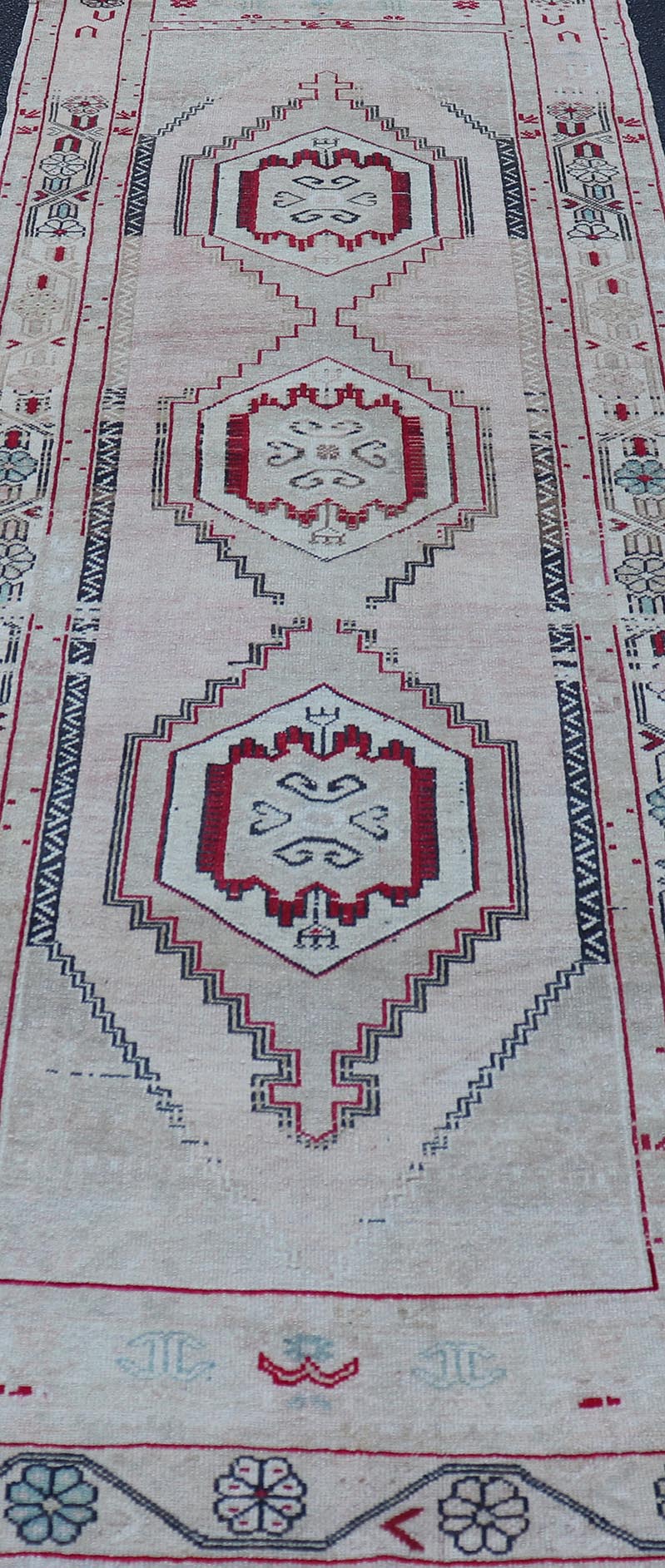 Vintage Turkish Oushak Runner with Medallions in Cream, dark blue, pink and Red. Keivan Woven Arts / rug EN-178468, country of origin / type: Turkey / Oushak, circa 1940. Measures: 3'7 x 10'6 This Turkish Oushak runner features stylized ...