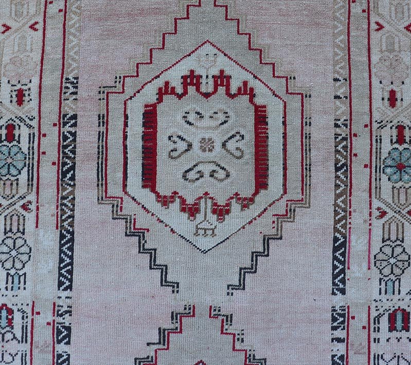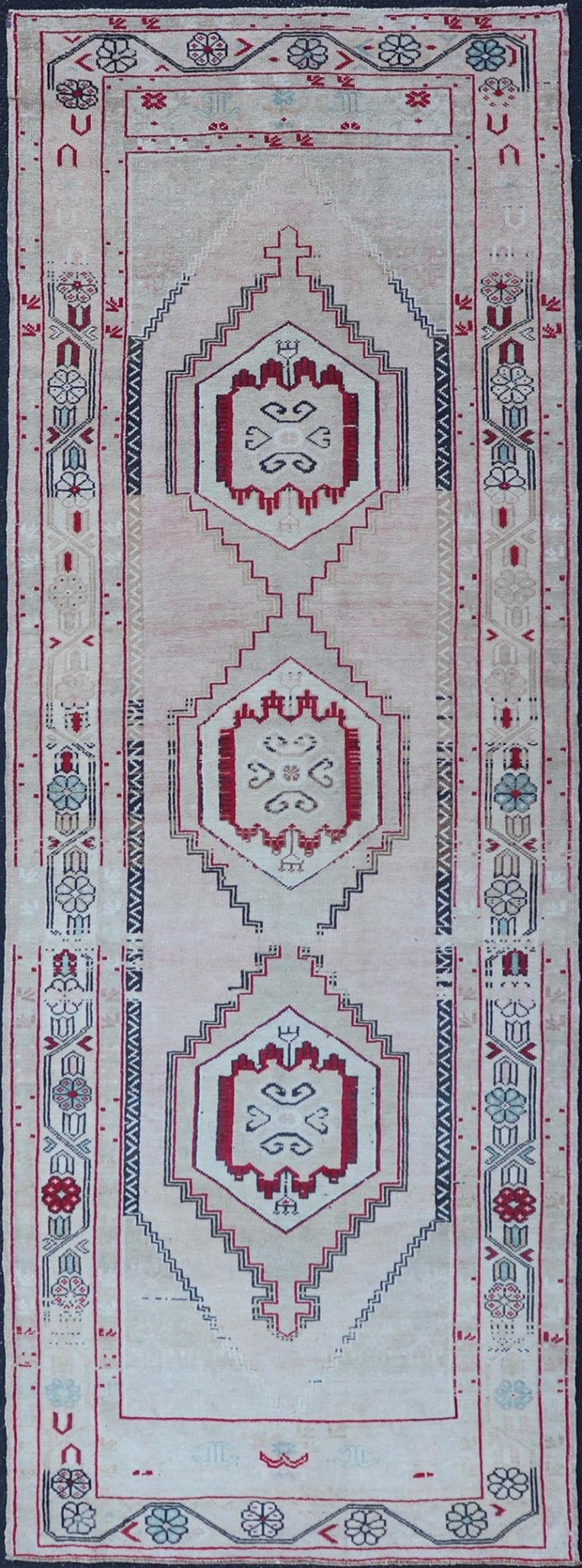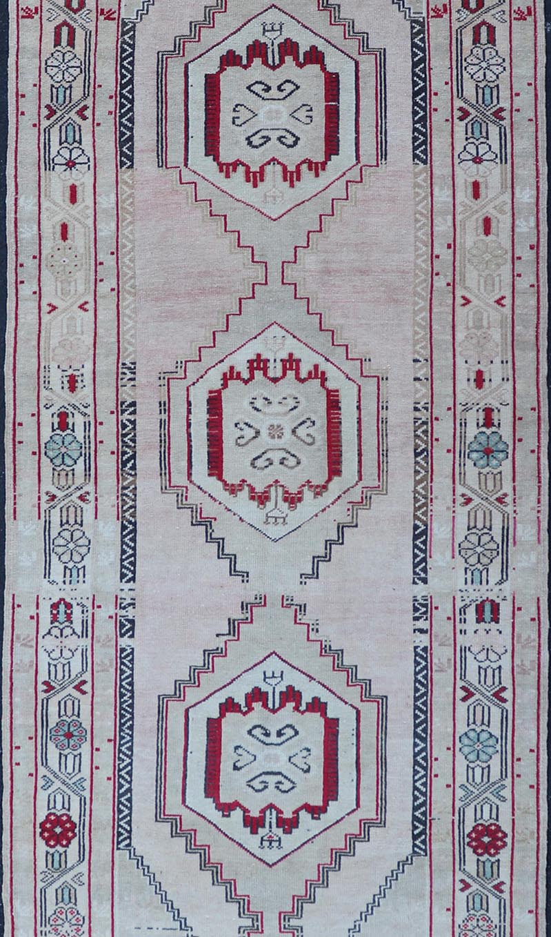 Vintage Turkish Oushak Runner with Medallions in Cream, dark blue, pink and Red. Keivan Woven Arts / rug EN-178468, country of origin / type: Turkey / Oushak, circa 1940.