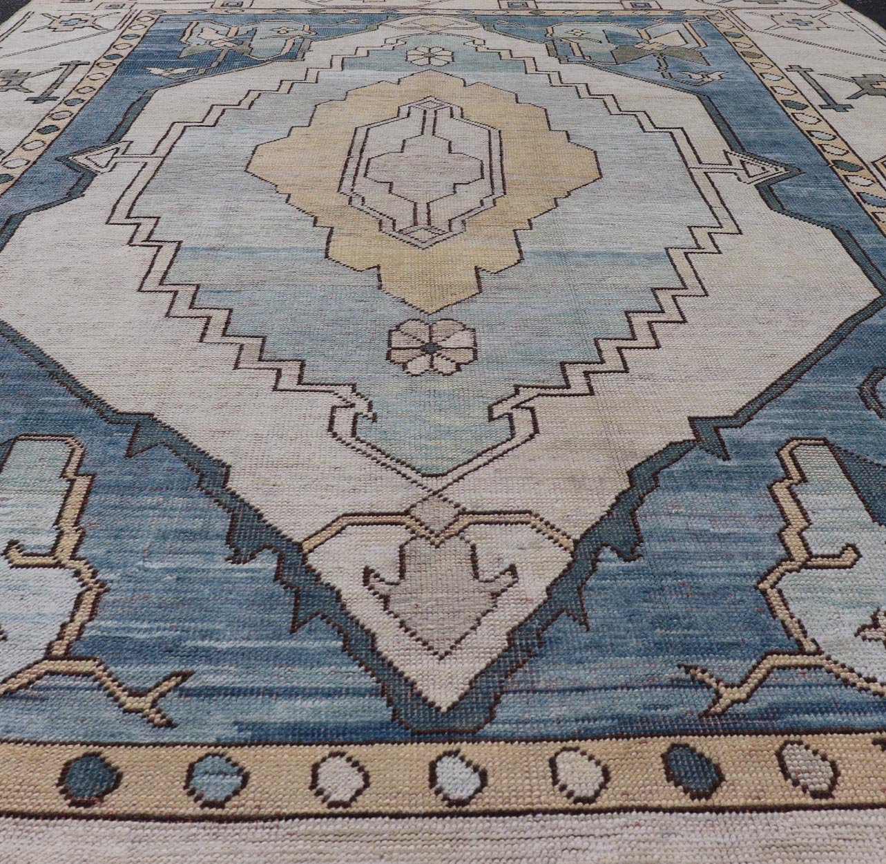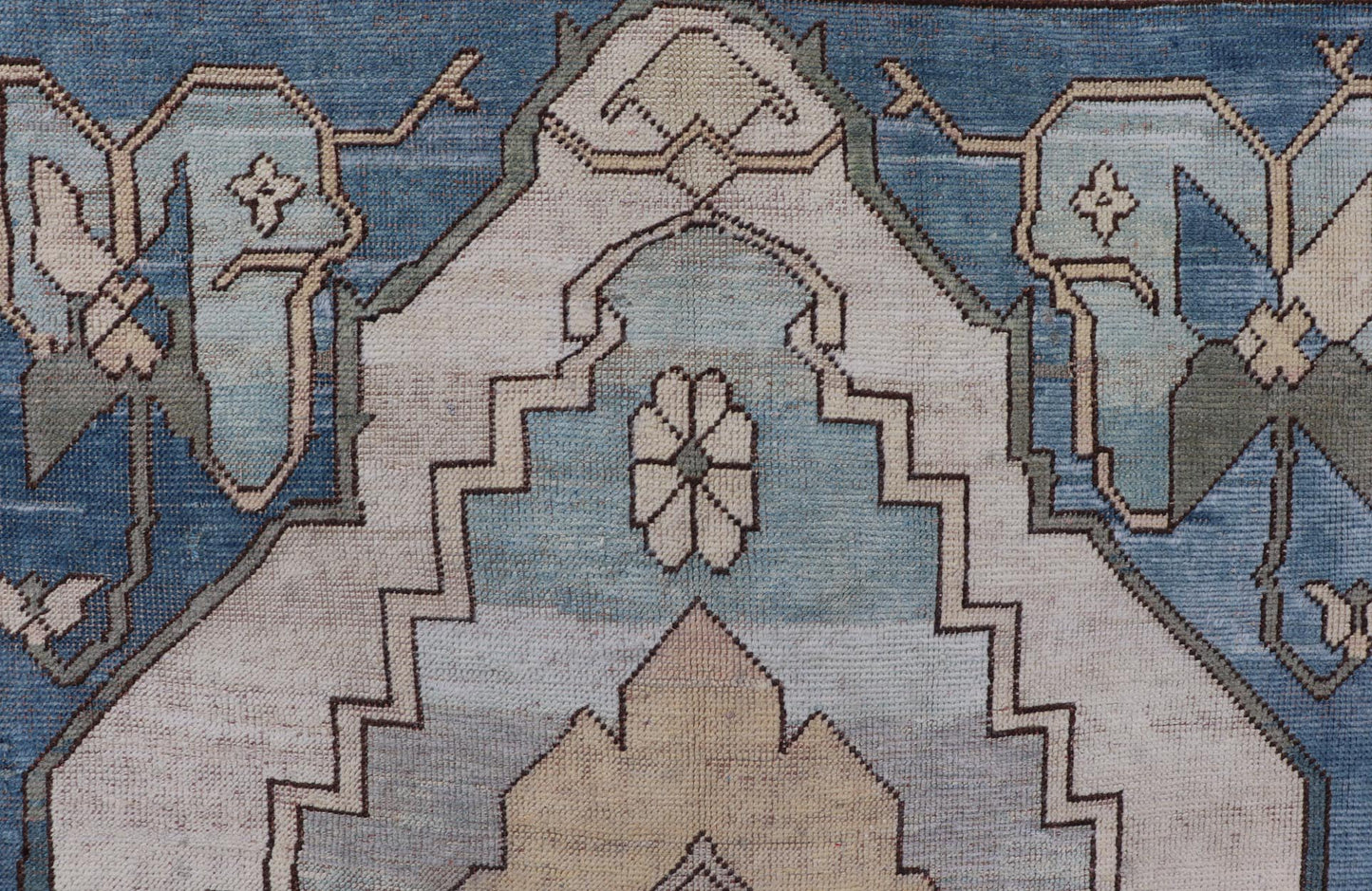 This vintage Oushak carpet from mid-20th century Turkey features a tribal medallion design rendered, set atop a blue background. The central field features floating motifs and the surrounding border consists of a repeating pattern of complementary designs.