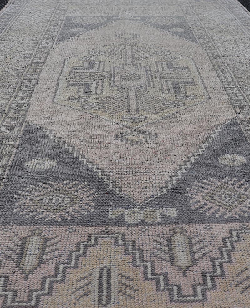 Vintage Medallion Turkish Oushak rug in muted taupe, light gray, blush, cream and light brown.