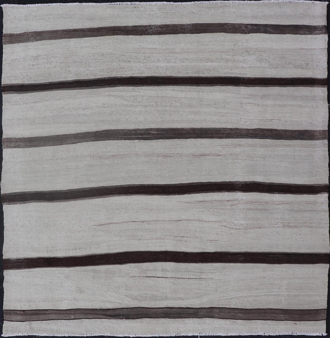 Vintage Flat Weave Turkish Kilim with Stripes in Ivory and Brown. Keivan Woven Arts / rug EN-15165, country of origin / type: Turkey / Kilim, circa Mid-20th Century. Measures: 4'6 x 4'10 This vintage flat-woven Kilim features a minimalist design...