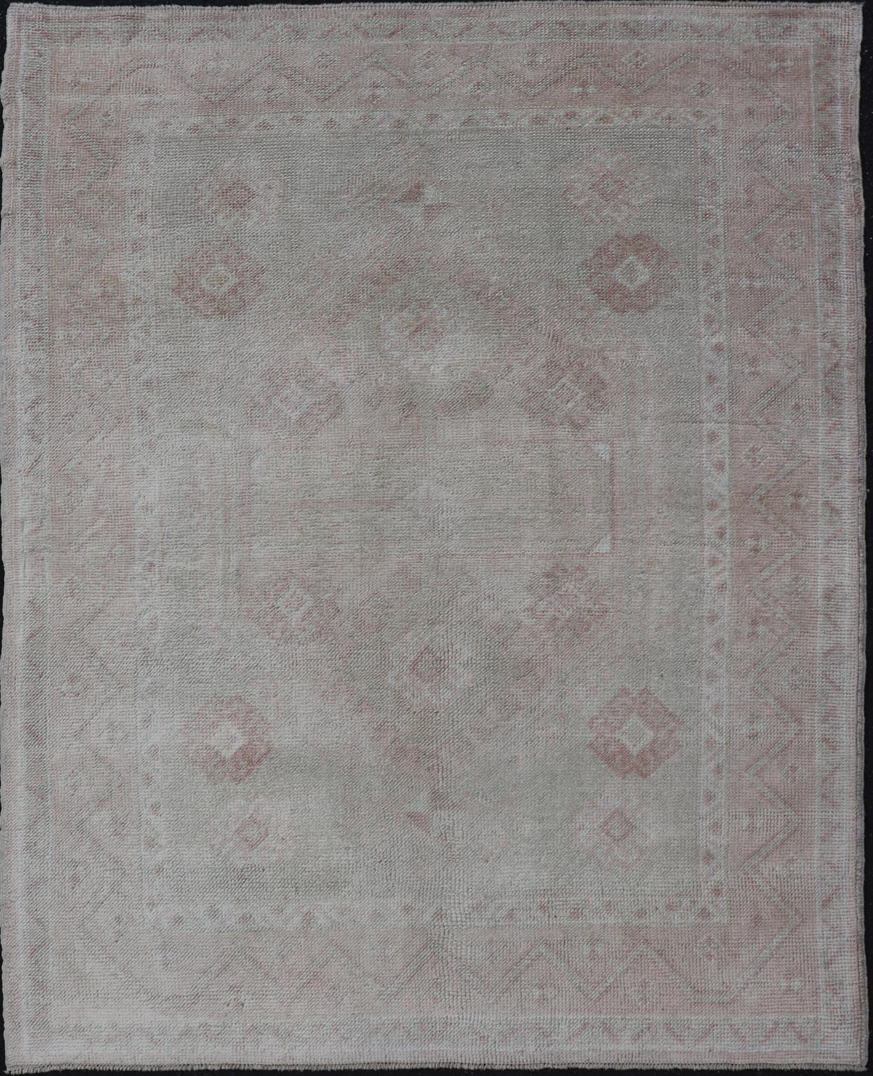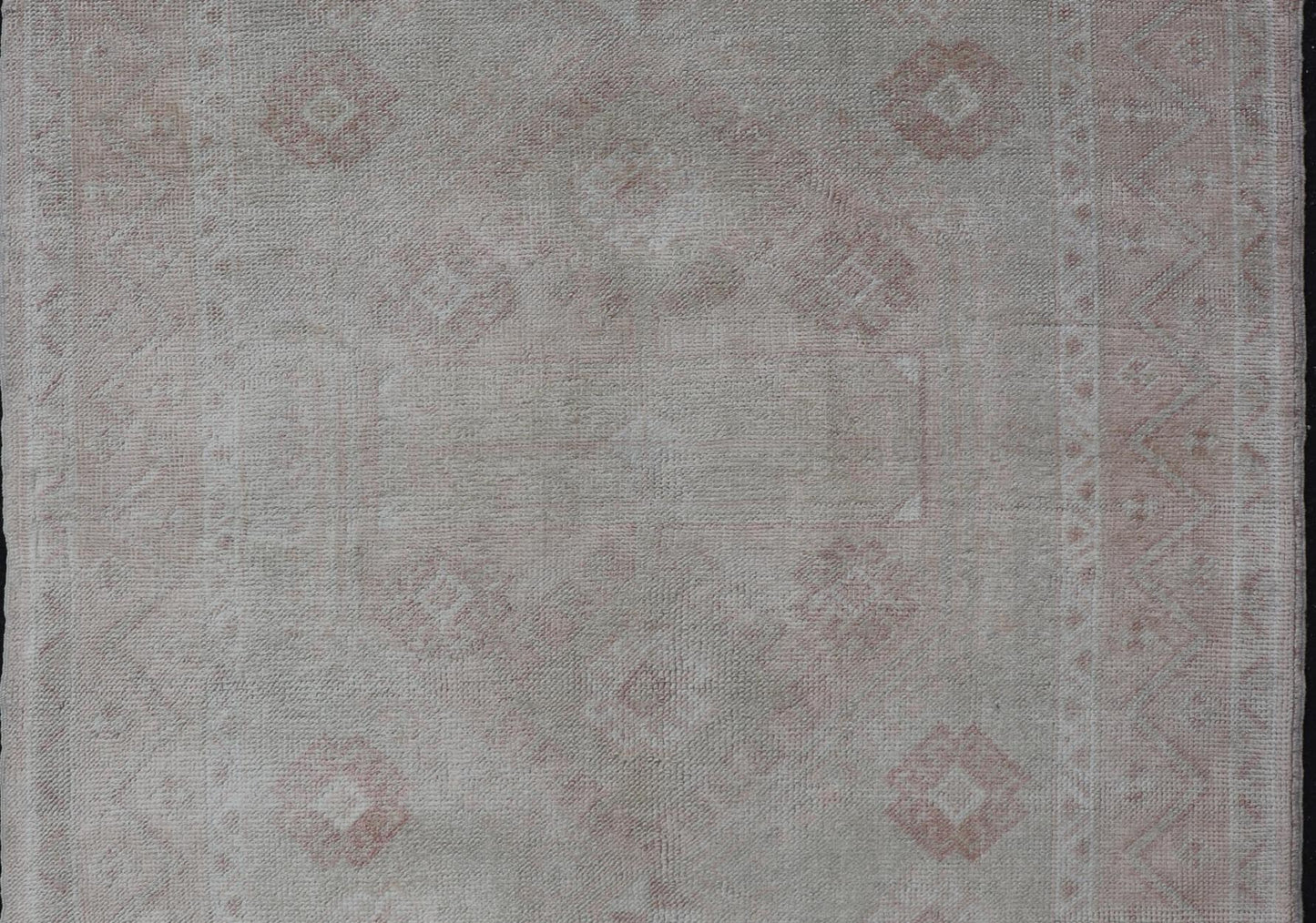 This vintage Turkish Oushak rug (circa mid-20th century) features a unique blend of colors. The multi-layered central medallion is complemented by a symmetrical set of floral motifs in the surrounding cornices and border. The various shades of tan, taupe, peach, light earthy tones blend beautifully. This vintage Oushak is in overall very good condition for its age, with even low pile throughout. Light Oushak rug, pastel Oushak, Light Oushak small rug, pastel Oushak rug,