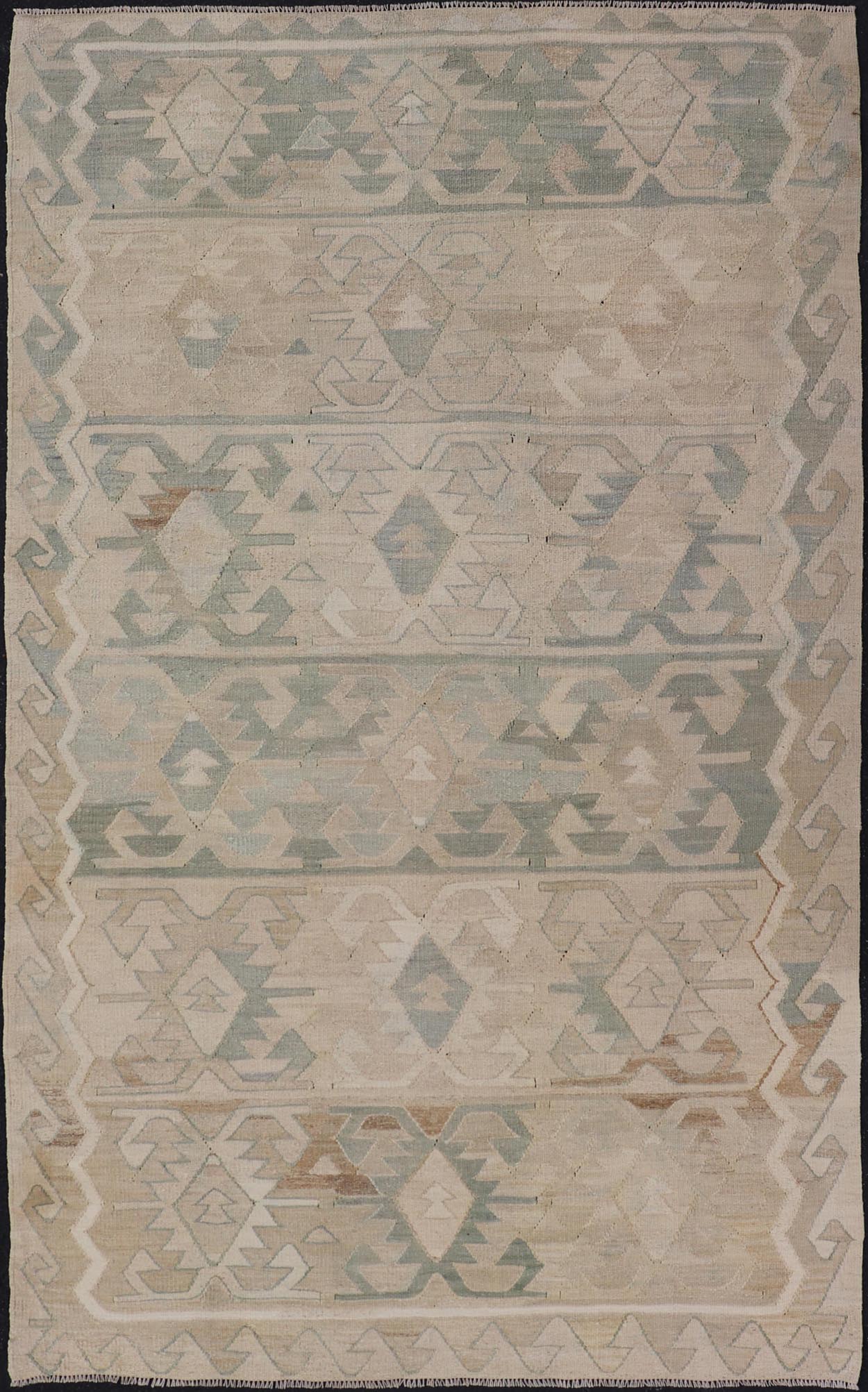 This flat-weave tribal Turkish kilim has been hand-woven in wool. The rug features an all-over sub-geometric design, rendered in light green and earthy tones; making this rug a superb fit for a wide variety of interiors.