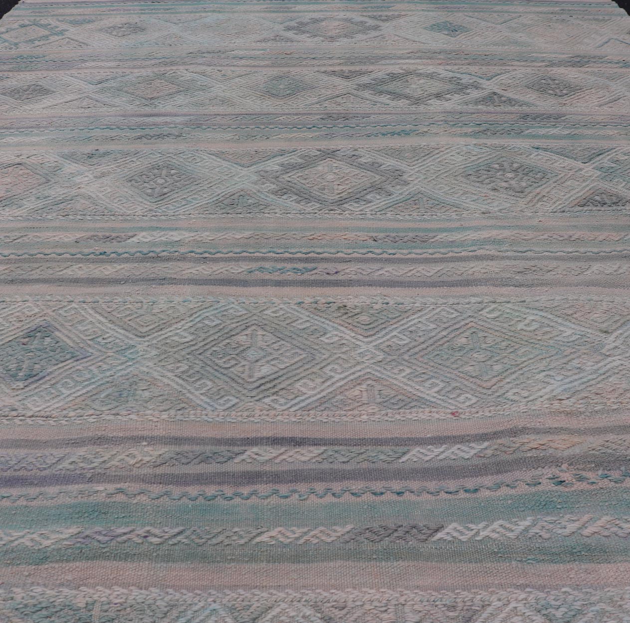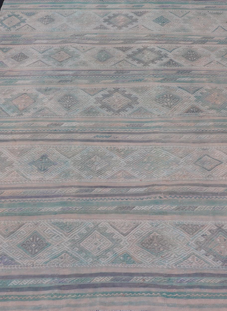 Turkish Vintage Kilim Flat-Weave with Embroideries Kilim in Pastel Color. geometric stripe design Vintage Kilim from Turkey, Keivan Woven Arts / rug EN-14029, country of origin / type: Turkey / Kilim, circa 1950