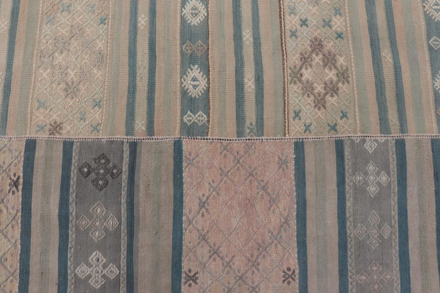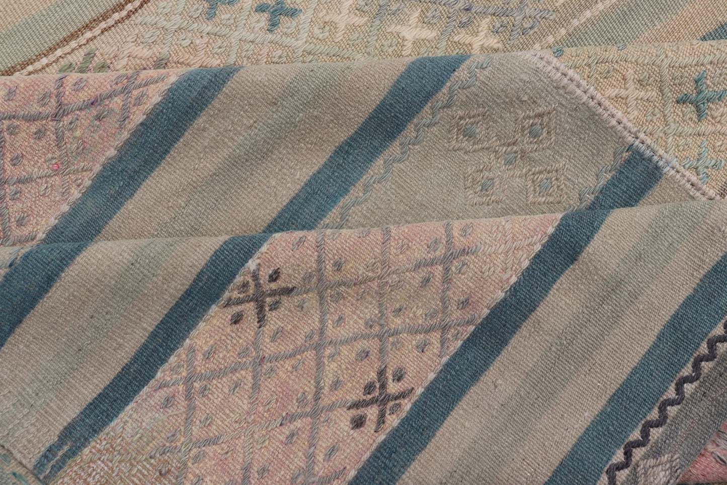 Large Vintage Paneled Kilim Flat-Weave in Blue, Pink, Taupe, Gray, Light brown, Keivan Woven Arts /rug / EN-14433, country of origin / type: Turkey / Kilim 1950s Measures: 11'5 x 17'0 Large Vintage Hand Woven neutral paneled Kilim flat-weave. Th...
