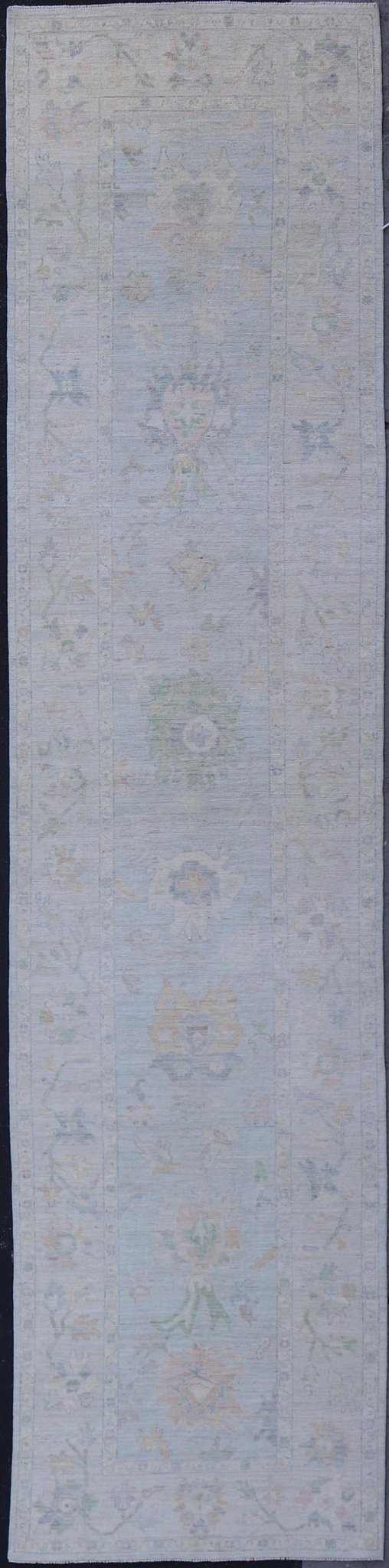 Neutral Color Gallery Oushak Runner with Medallion Design in Light Blue Field. Keivan Woven Arts; rug AWR-17798 Country of Origin: Afghanistan Type: Oushak Design: Medallion, Motif, Floral Motif.
